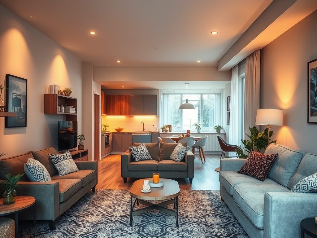 Jeśli masz kuchnię, zaplanuj aneks kuchenny z wysokimi zabudowami, montując sprzęt AGD w pionie oraz stosując składane blaty dla większej funkcjonalności. Oświetlenie zaplanuj warstwowo, łącząc światło sufitowe, lampy stojące i stołowe oraz wykorzystując naturalne światło przez odsłonięte okna.